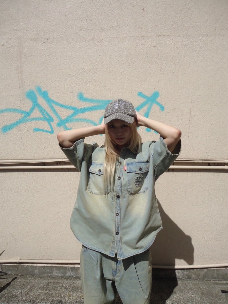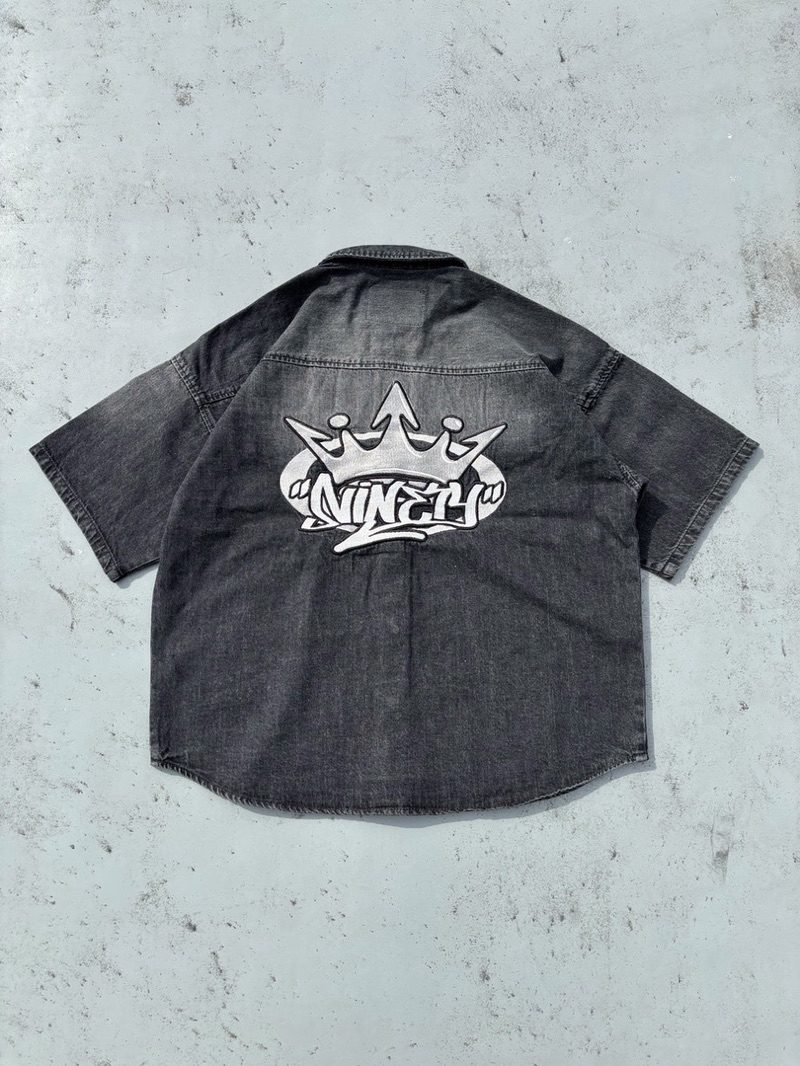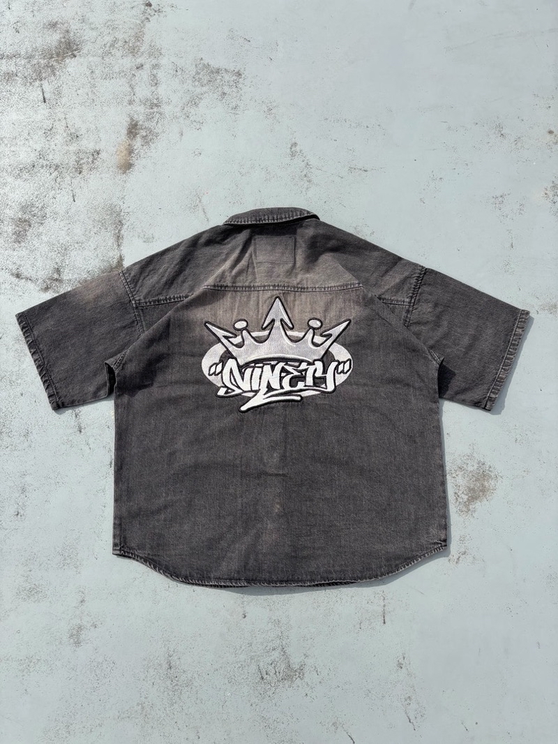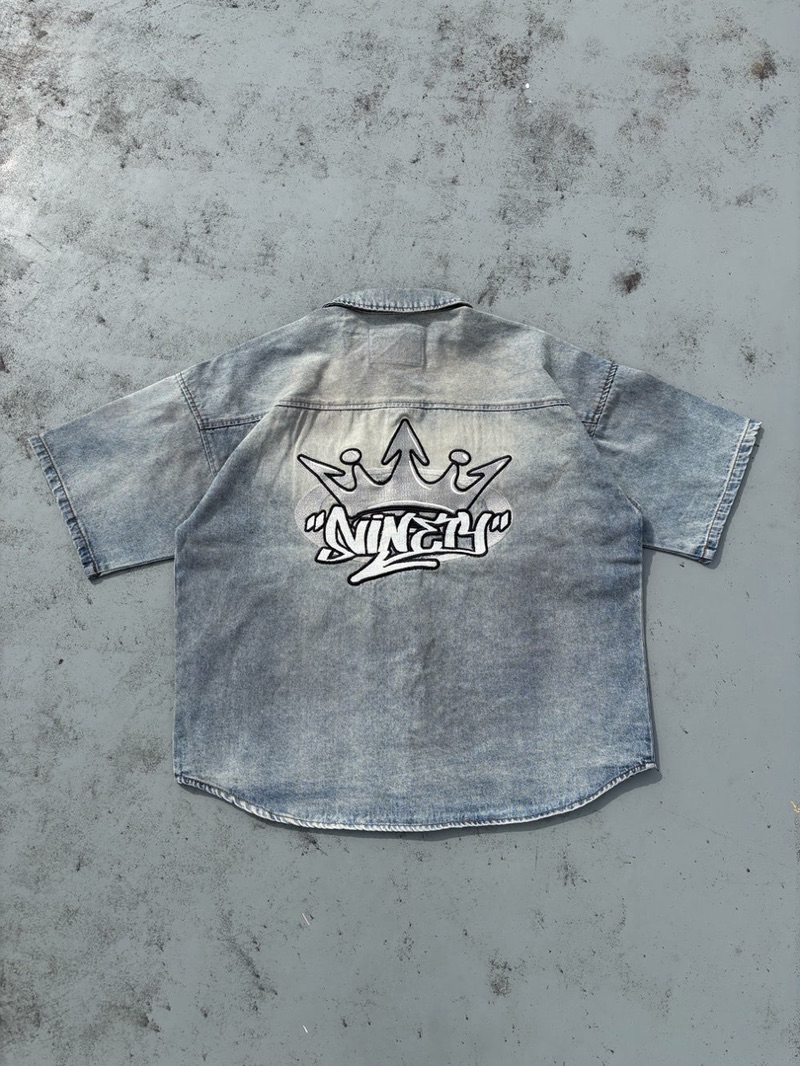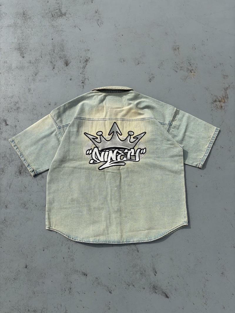 デニム生地に程よいビンテージ加工が施されており、胸元とバックにインパクトあるKing Logoの刺繍。