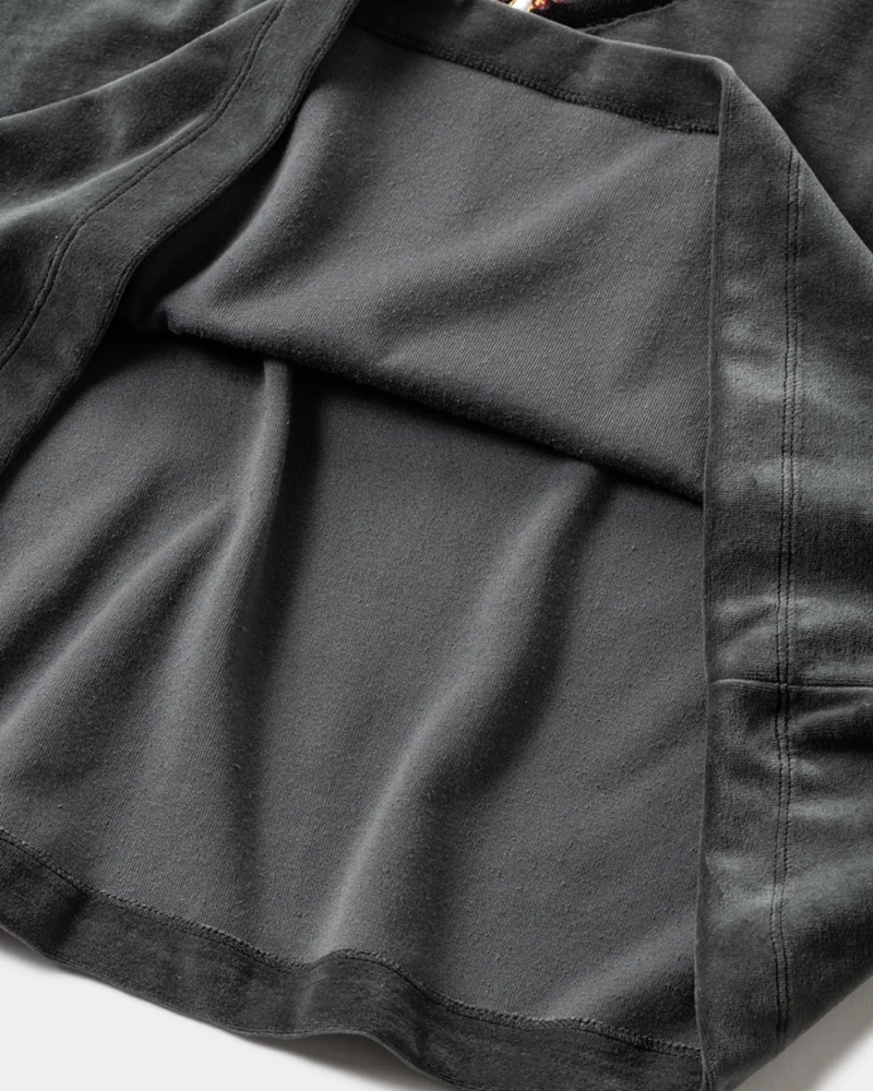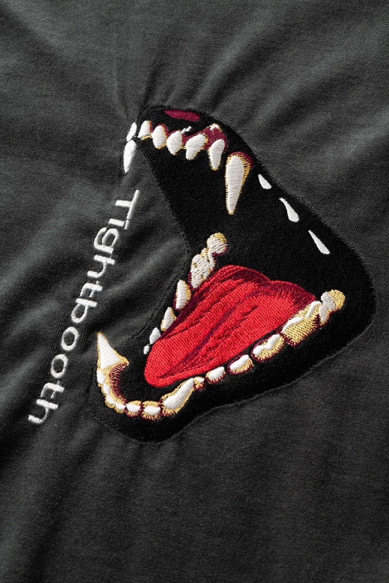 犬の口を模ったBITEグラフィックを刺繍で表現した7分丈のベロアTシャツ。